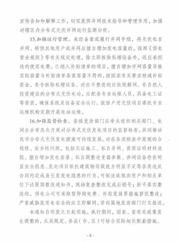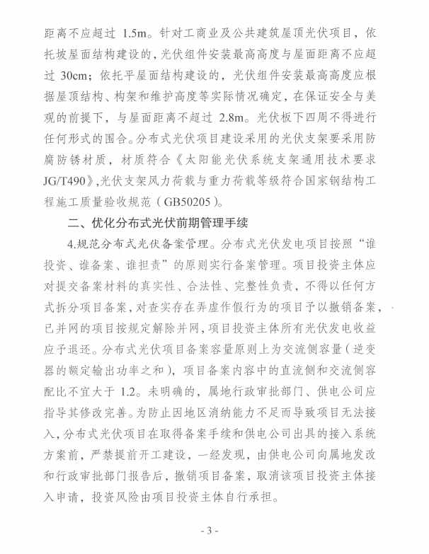 分布式光伏應依托合法建筑物及設施,由相關(guān)部門(mén)依據相關(guān)規定審批,不得在違建建筑物或設施上建設。對于已認定違建的在途分布式光伏項目不予并網(wǎng)。違建建筑設施上的光伏在拆遷時(shí)不計入賠償補償范圍。另外,分布式光伏發(fā)電項目按照“誰(shuí)投資、誰(shuí)備案、誰(shuí)擔責”的原則實(shí)行備案管理。在取得備案手續和供電公司出具的接入系統方案前,嚴禁提前開(kāi)工建設。