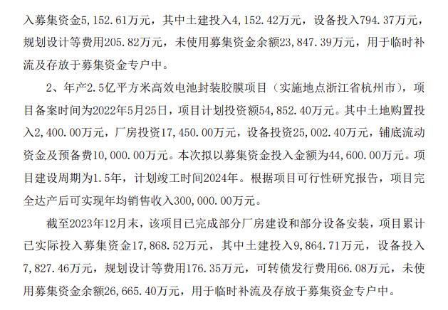 公告顯示,截至2023年12月末,“年產(chǎn)2.5億平方米高效電池封裝膠膜項目”已完成部分廠(chǎng)房的建設工作,累計已實(shí)際投入資金5152.61萬(wàn)元;“年產(chǎn)500萬(wàn)平方米撓性覆銅板(材料)項目”已完成部分廠(chǎng)房建設和部分設備安裝,累計已實(shí)際投入資金1.79億元。