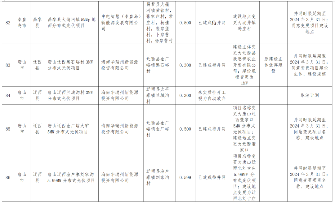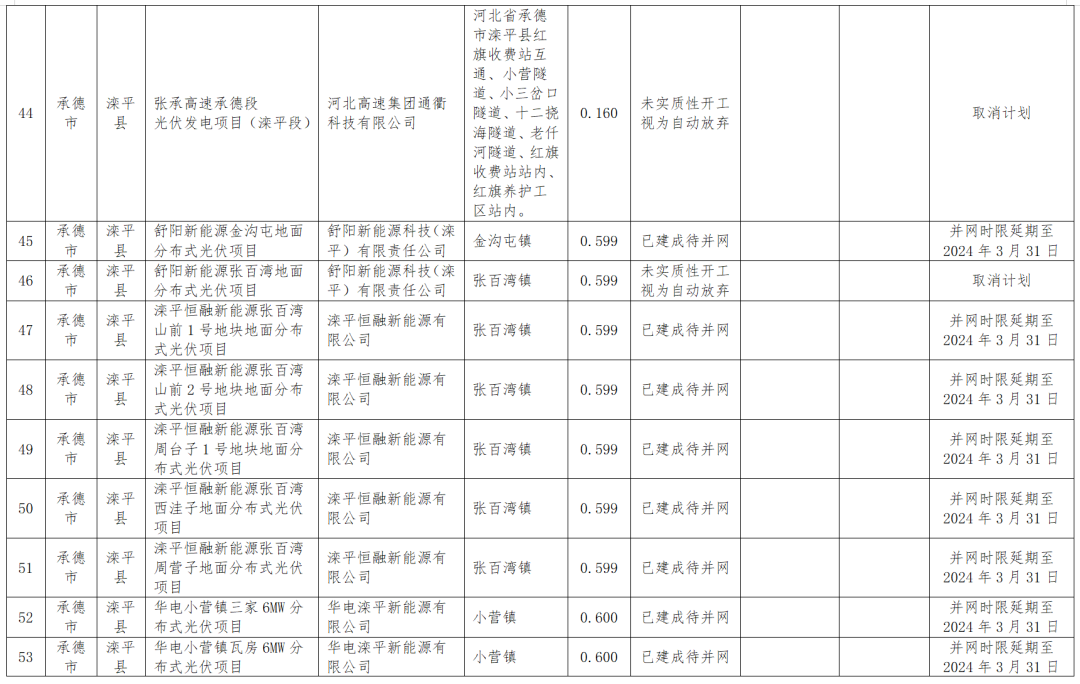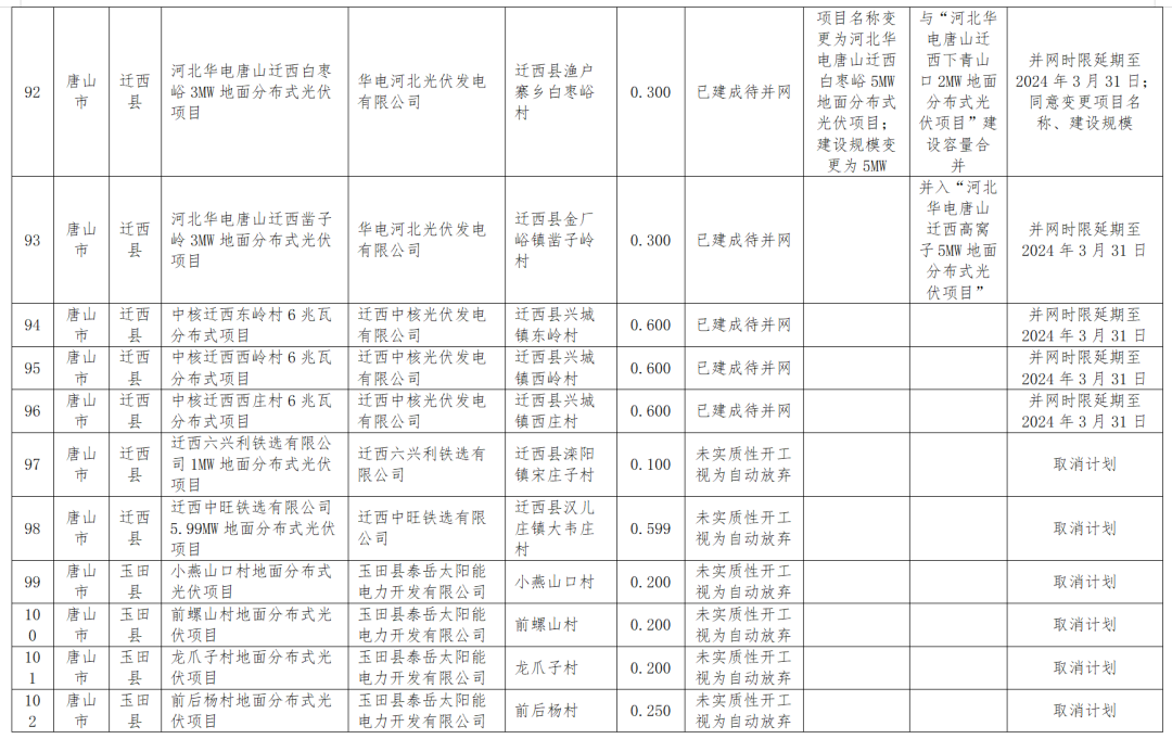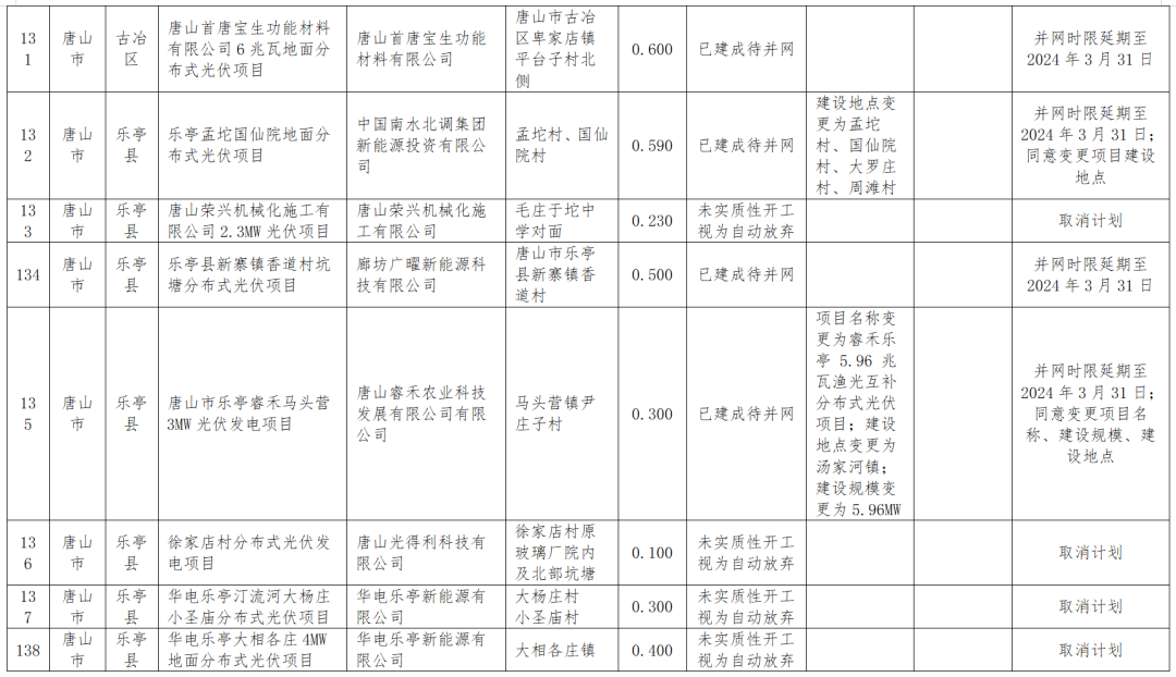 1月18日,河北能源局公示四季度風(fēng)光集中并網(wǎng)行動(dòng)到期風(fēng)電、光伏項目擬調整情況,被調整的共涉及100MW風(fēng)電、2.17GW光伏以及1.2GW地面光伏項目,其中部分項目取消計劃,還有一部分轉為儲備類(lèi)或者延遲并網(wǎng)。調整項目涉及的業(yè)主包括特變電工、中廣核、大唐、英利、深能、國華等。