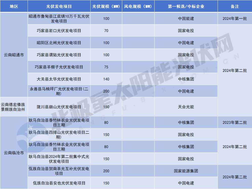 具體到業(yè)主來(lái)看,在已公布項目第一候選/中標企業(yè)中,中國電建中標規模最大,達到700MW;緊隨其后的是國家電投,所獲規模達695MW;天合光能、中核集團、國家能源集團、正泰新能源&中廣核(聯(lián)合體)所獲規模均達320MW及以上。此外,云投集團、華電、大唐、楚雄州金江能源集團有限公司、中廣核、華能集團&隆基綠能(聯(lián)合體)等企業(yè)均有所獲。