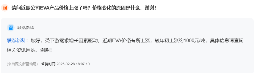 事實(shí)上,此輪漲價(jià)自年后已經(jīng)開(kāi)始逐漸升溫。此前,有投資者通過(guò)互通平臺向聯(lián)泓新科詢(xún)問(wèn)價(jià)格上漲事宜。聯(lián)泓新科于2月28日回復稱(chēng),受下游需求增長(cháng)因素驅動(dòng),近期EVA價(jià)格有所上漲,較年初上漲約1000元/噸。