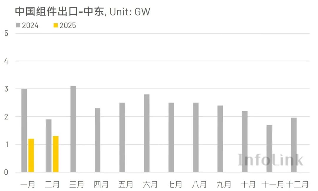 2025 年 1 月中國共出口中東市場(chǎng)約 1.18 GW 的光伏組件,與 2024 年 1 月的 2.95 GW 相比下降 60%;二月則出口約 1.32 GW 的光伏組件,與去年二月的 1.85 GW 相比下降 29%。截至今年二月底,中國一至二月共出口中東市場(chǎng)約 2.49 GW 的光伏組件,同比去年 4.8 GW 下降 48%。其中本次數據中觀(guān)察,中東為唯一相對一月量體增長(cháng)的國家,幅度約 12%。